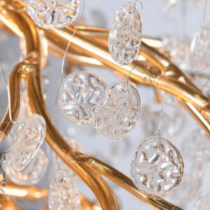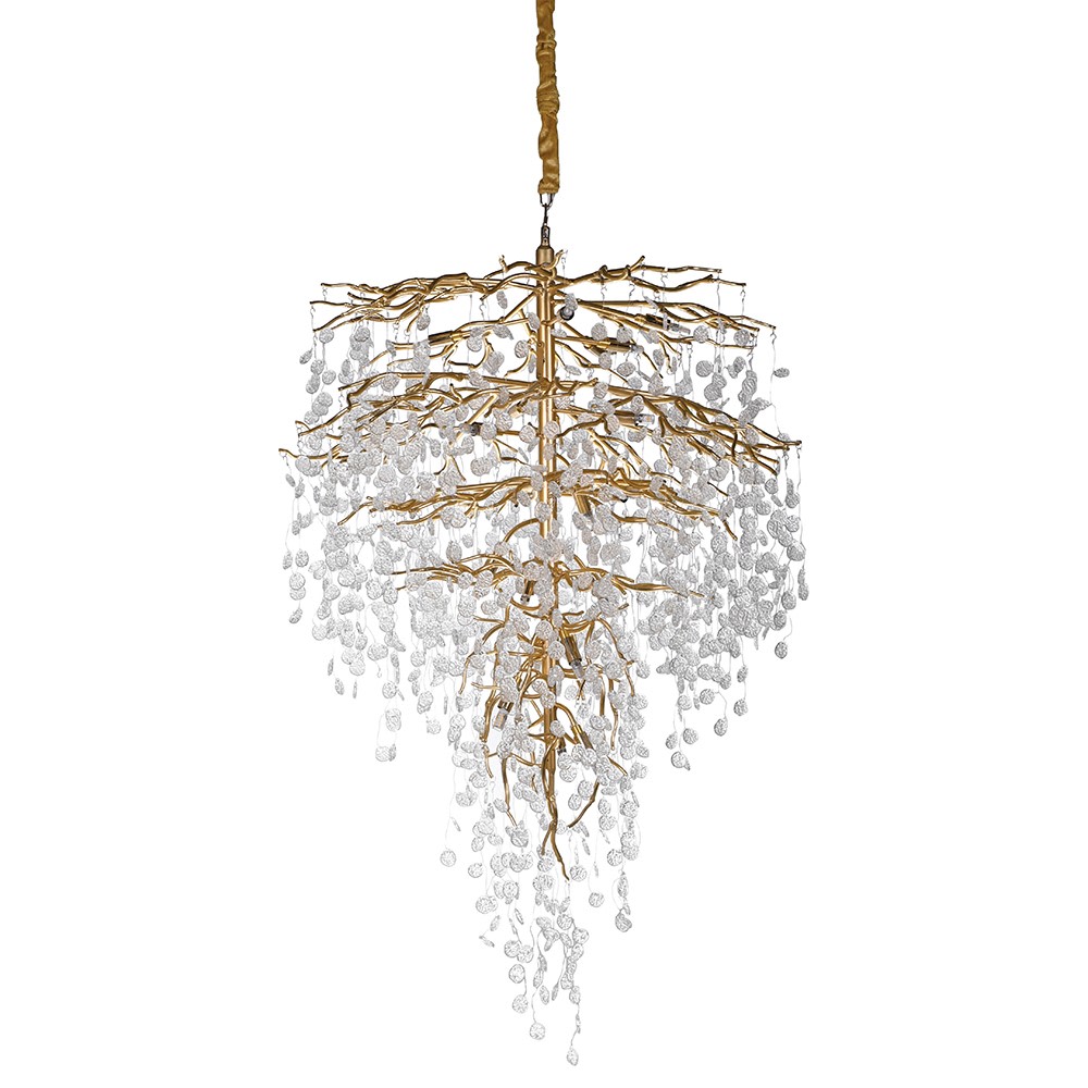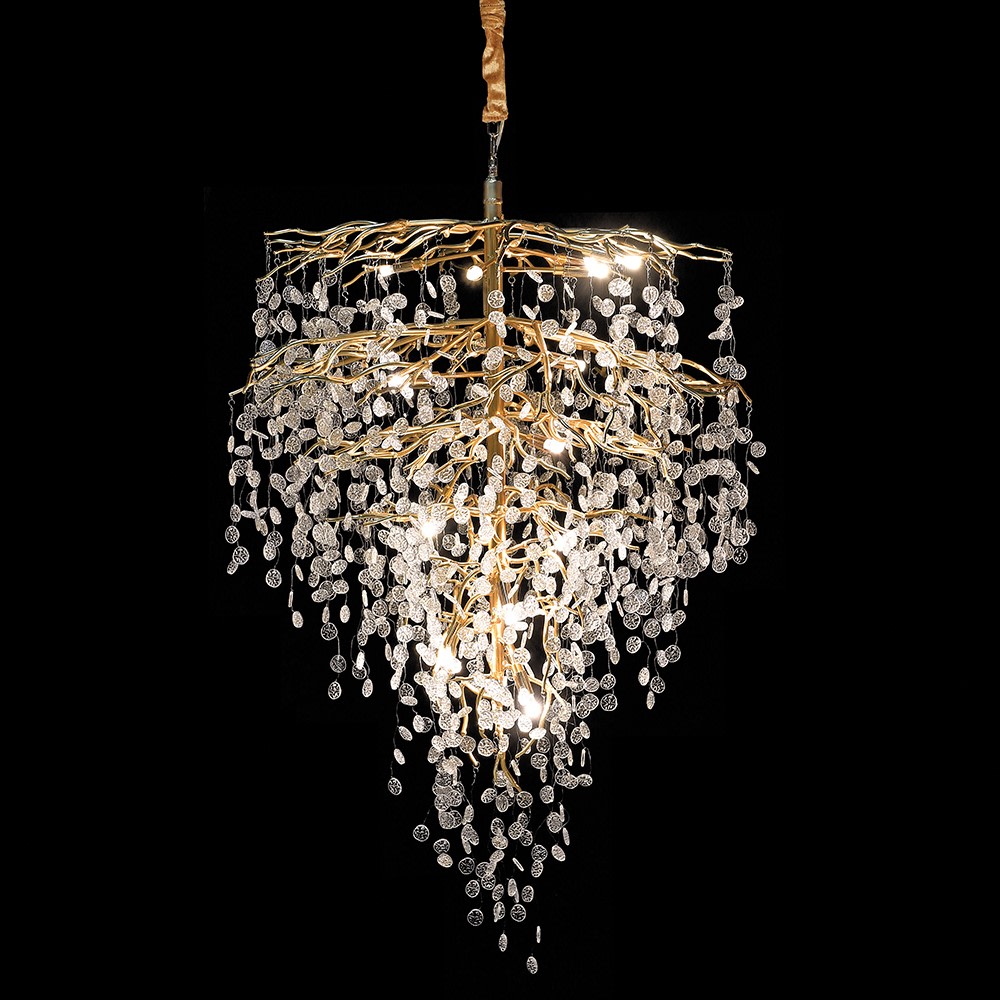 En verkligt fin design har denna unika taklampa. Påminner nästan om ett vattenfall. Den är ganska stor både i längd och omfång. Men har du plats för den, gör den hela rummets karaktär till något alldeles extra spektakulärt. Tillverkad i guldmetall och glas.  30 stycken lampa G9 lyser upp inne i lampan, (medföljer ej). Kedjans längd 1M, justerbar.