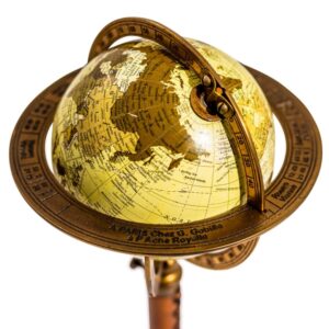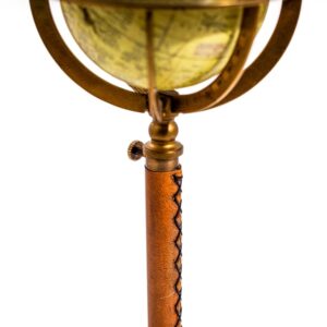 En mindre variant av jordglob, passar fint på ett skrivbord. Globen ligger i en ställning med ett läderklätt stativ, lite exklusivare än vanligt. Står på tre metall ben som går att fälla ihop.