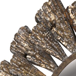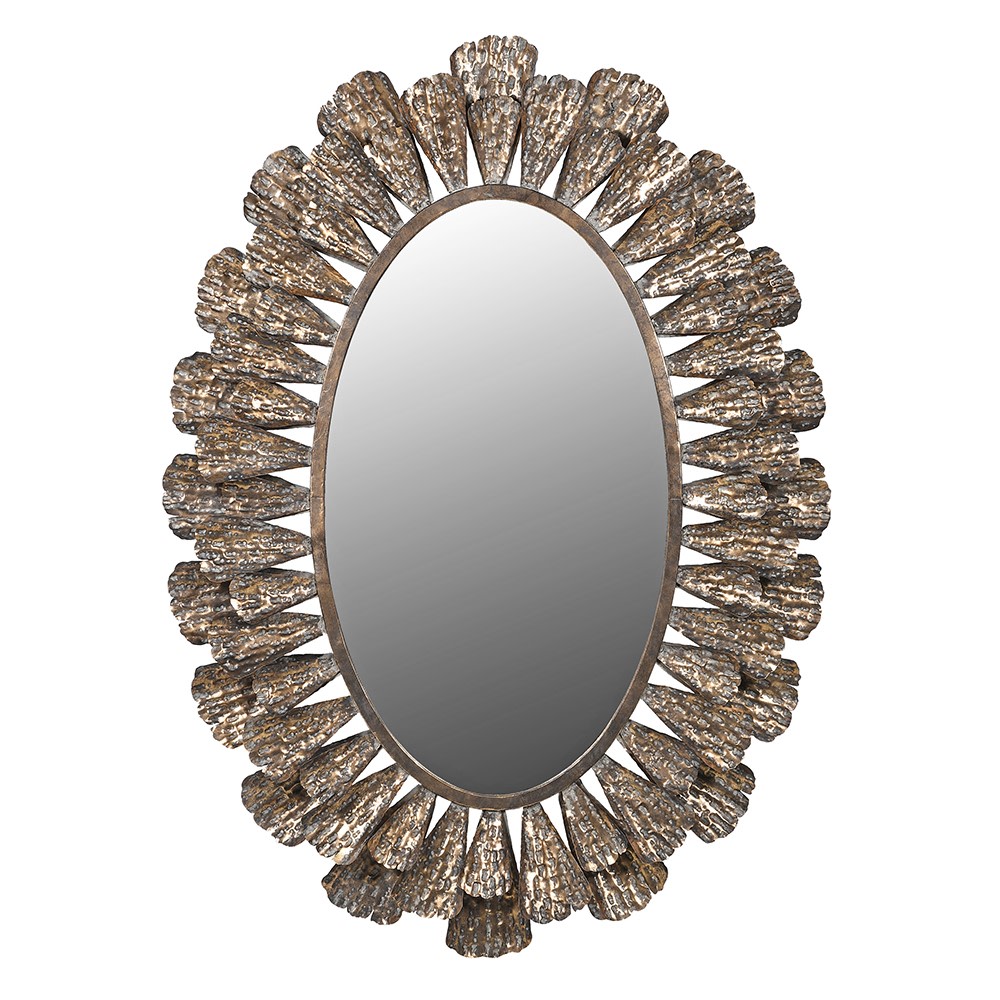 En spegel som ”syns”. Vem har sagt att en oval spegel är tråkig. Inte denna, den tar för sig rejält. Tillverkad helt i patinerad guldmetall. Passar i princip överallt i ditt hem, där du vill ha en stor spegel som sticker ut.