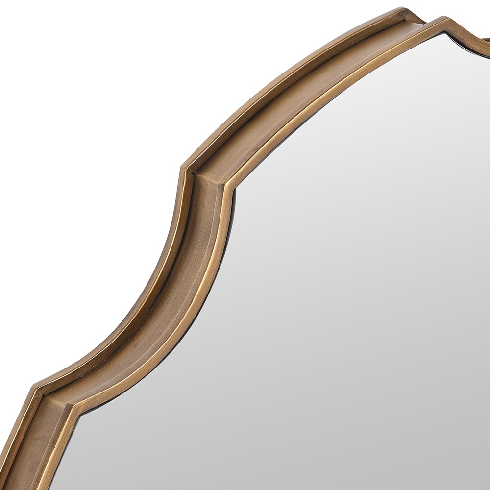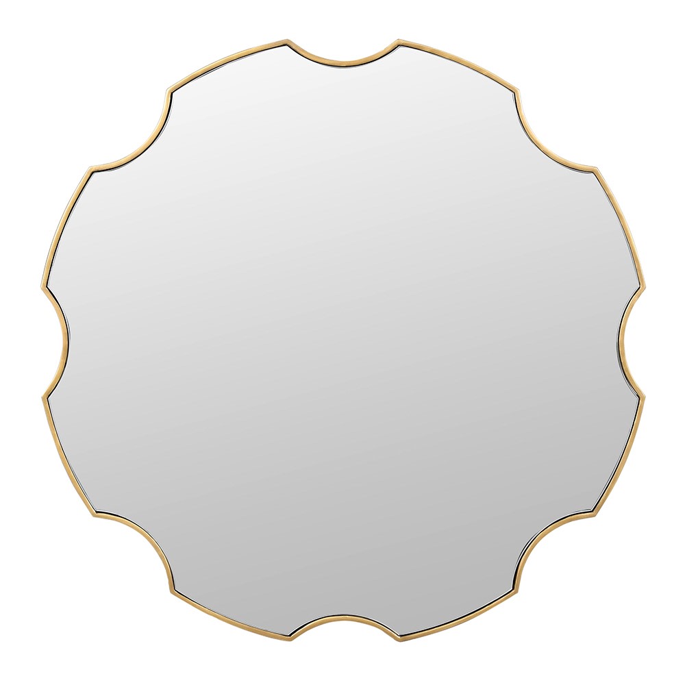 En större rundaktig spegel med guldram. i metall. Passar bra överallt där du vill ha en större spegel som triggar design nerven. Den är rund, fast ändå inte …..