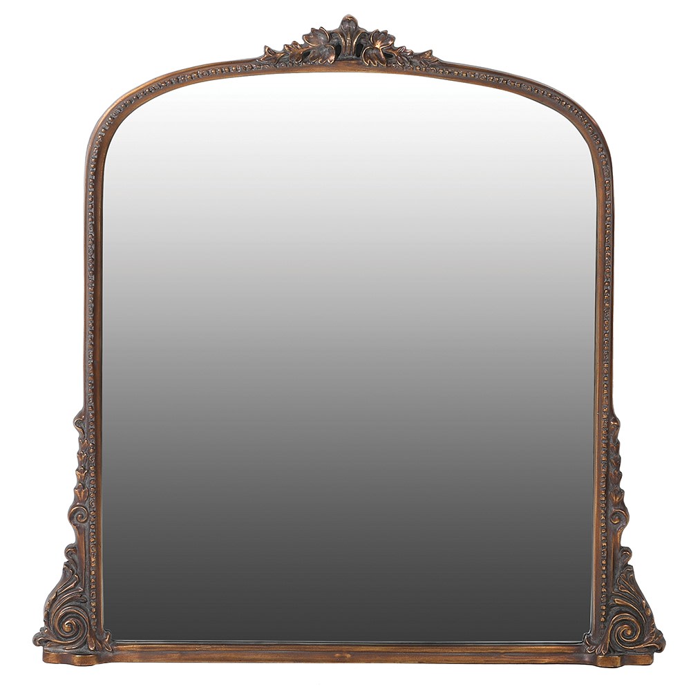 Denna spegel är gjord för att hängas över en öppen spis. Tillverkad i trämassa, som sedan patinerats för hand, för att få den antika looken.