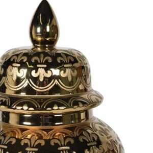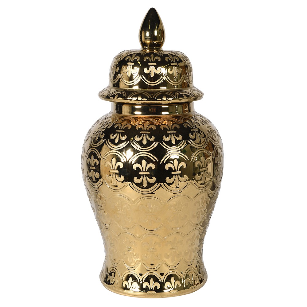 En lagom stor urna i glänsande guld med ett svagt relieifmönster. Urnan har ett lock med en stilren vacker knopp. Den är tillverkad i keramik.
