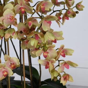 En otroligt vacker orkidè, som heter Butter Phalaenopsis ute i naturen. Den är planterad i en skål och överst ligger det lite mossa. Man kan även se lite rötter som sticker fram lite här och där. Den har flera stänglar och många blommor, som gör att den mycket exklusiv.