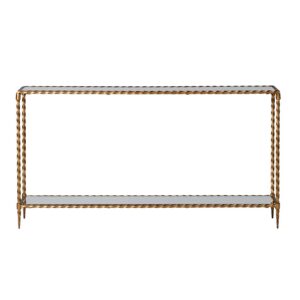 Ett längre konsolbord med smal midja. Ibland behöver man ett lite längre och smalare konsolbord i sin inredning. Tillverkat i vriden mässing, med dubbla spegelglasskivor för fin exponering. Passar överallt.