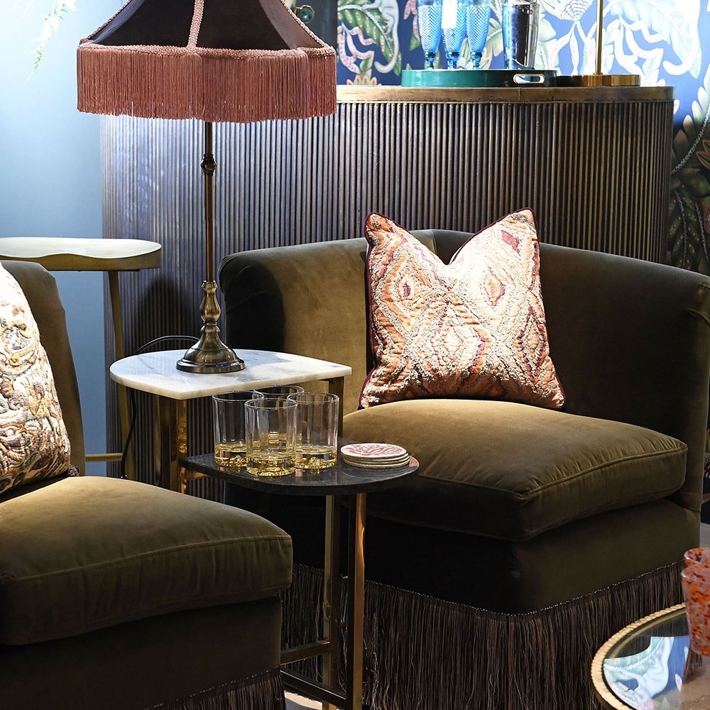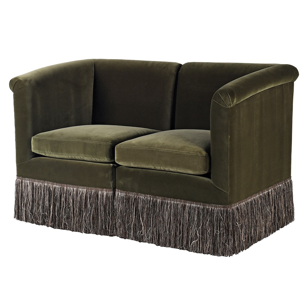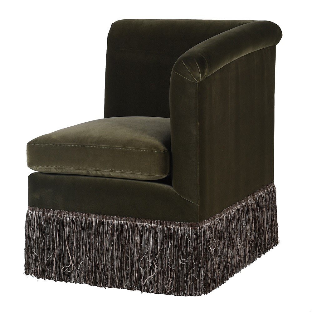 En verkligt anpassningsbar fåtölj som kan användas som solitär, med ett litet bord emellan eller bygga en liten soffa. Stomme av trä klädd med en grön bomulls sammet. Nederdelen är försedd med frans runtom. Ange i beställningen höger eller vänster, eller kanske båda.