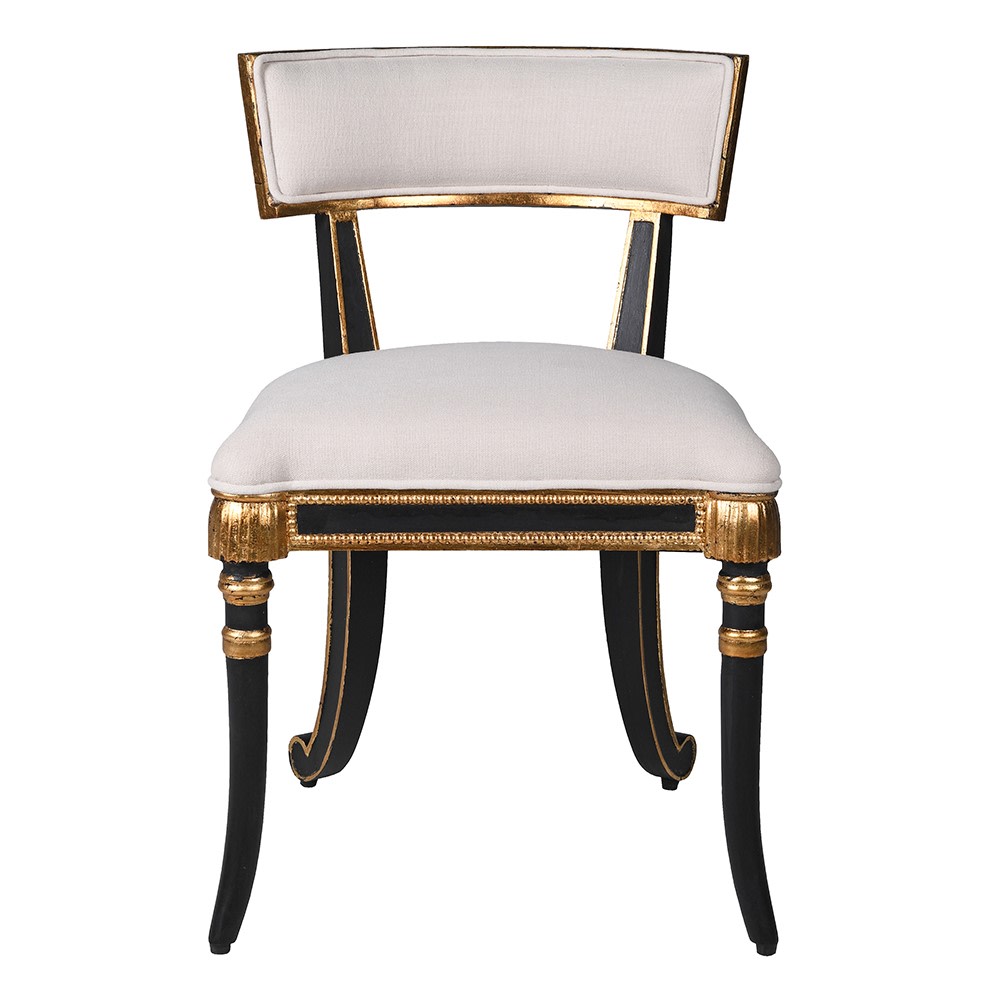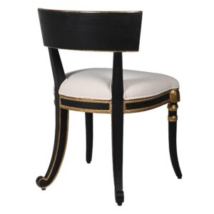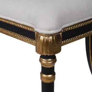 En matrumsstol i Fransk empirestil är inte lätt att finna i dessa tider, men här är den. Dessutom med lätt utställda ben. Den massiva trästommen svartmålas först, sedan dekormålas detaljerna i guld för hand. Då får man fram något unikt. Sits och rygg är klädda i ett offwhite linnetyg
