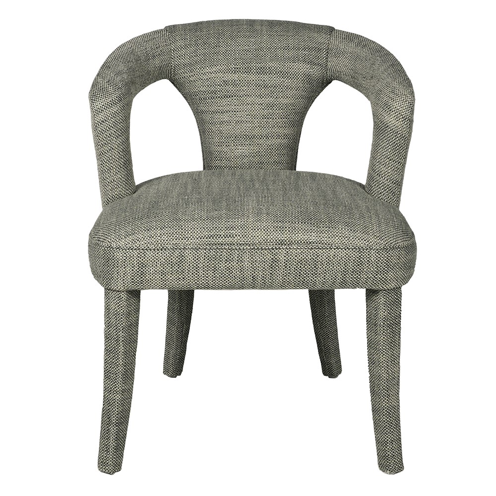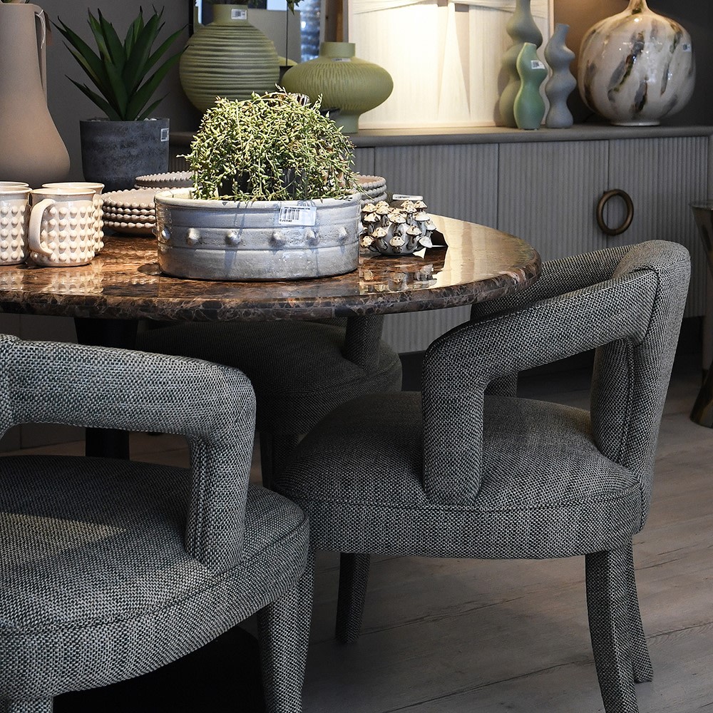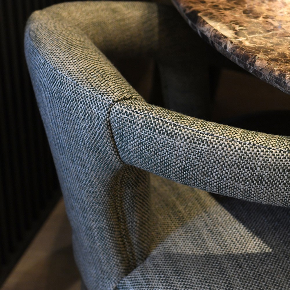 En nätt, men ändå skön matrumsstol i continental stil. Stomme av massivt trä, som är helt klädd med ett vävt oömt tyg av linne och konstfiber, för bra hållbarhet.