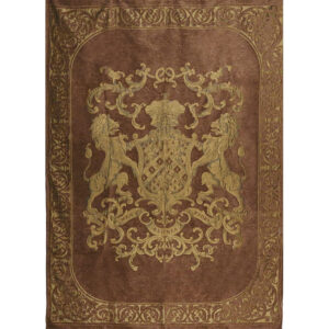 Exklusiv kudde i brunt och guld med adelsvapen, dubbelsidig. Levereras komplett med dunfjäderfylld innerkudde.
